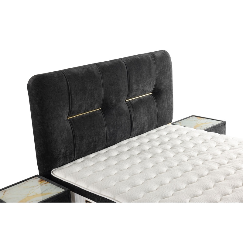 Tumma verhoilu ja kultaiset yksityiskohdat tekevät sängystä näyttävän sisustuselementin. Sopii erityisesti moderniin, hotellityyliseen ja eleganttiin sisustukseen.